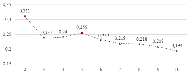 Чем выше силуэт-коэффициент, тем более оптимальным можно считать распределение выборки по кластерам. Как демонстрирует график, наиболее эффективное решение – распределить арабские страны на две основных группы (табл.1).