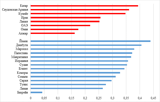 Характерно, что в отдельную группу выделены Ливия, Ирак и Алжир, как страны с относительно высоким ИЧР, обеспеченностью ресурсами, однако ограниченным доступом к финансовым и научно-технологическим ресурсам. Все из указанных стран в конце XX века взяли курс на социалистическую переориентацию, поддерживали тесные идеологические и хозяйственно-экономические отношения с СССР. В отличие от Египта, страны данной группы менее эффективно адаптировались к реалиям после распада Советского союза, оказались подвержены социально-политической нестабильности, что, как следствие, затормозило диверсификацию экономик, инвестиционный и воспроизводственный процессы.
