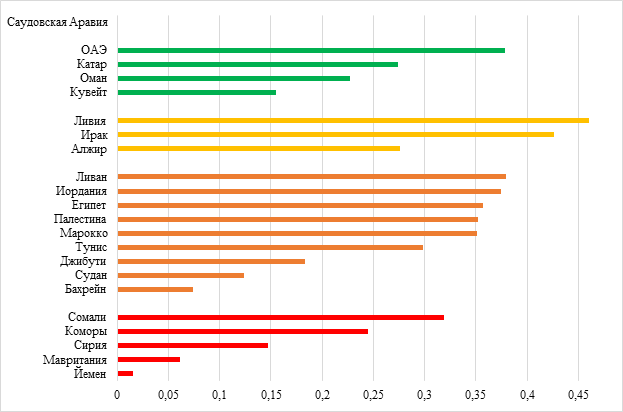 Характерно, что в основе всех вышеперечисленных типологий лежит выделение в отдельную группу стран ССАГПЗ, а самой многочисленными оказываются «средние» по отобранным показателям страны. В связи с этим, разработанная в рамках данного исследования кластеризация перспективна с точки зрения прикладного применения и углубления теоретического анализа – с обособлением Саудовской Аравии как исключительно устойчивой нефтеориентированной экономики и дроблением широкого «среднего» класса арабских государств.