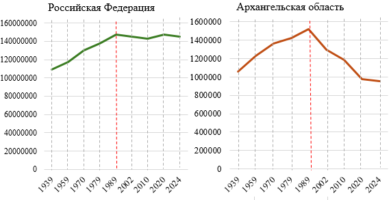 Рис. 1 Изменение численности населения в Архангельской области и Российской Федерации (без учета присоединения новых регионов) за период с 1939 г. по 2024 г., человек
