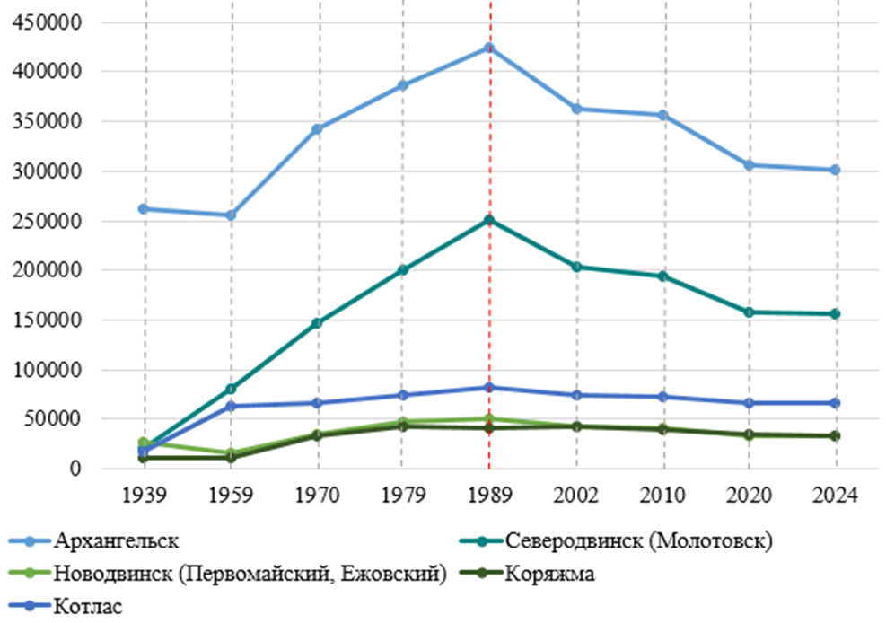 Нами был проведен сбор и последующая обработка социально-экономической информации по муниципальным образованиям Архангельской области, включая, 7 городских округов и 19 муниципальных округов и районов, по состоянию на 1 января 2024 года [15]. Основными источниками информации стали данные Управления Федеральной службы государственной статистики по Архангельской области за период 1989-2024 гг. и данные переписи населения Архангельской области за 1939, 1959, 1970, 1979, 1989, 2002, 2010, 2020 годы [8, 16].