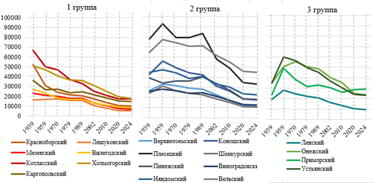 Рис. 3 Изменение численности населения в муниципальных округах и районах Архангельской области по группам за период с 1939 по 2024 гг.