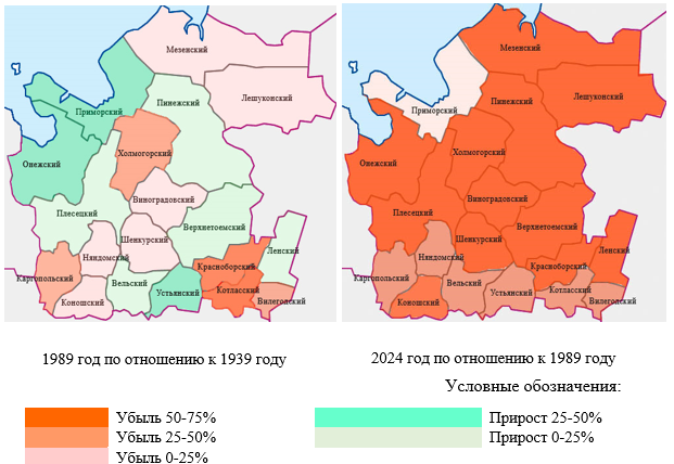 Как представлено на рисунке 4, за период с 1939 г. по 1989 г. наблюдается устойчивое развитие и прирост численности населения примерно на половине территории, тогда как за период с 1989 г. по 2024 г. в большинстве муниципальных округов и районов наблюдается убыль населения более 50 %.