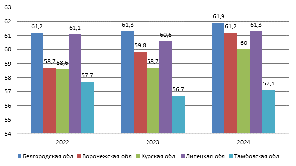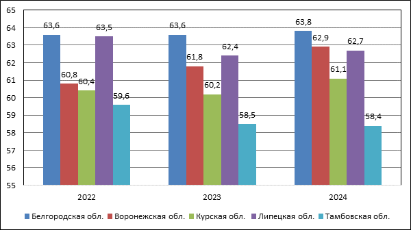 Анализ динамики показателя «уровень участия в составе рабочей силы» за 2022-2024 гг. по обследуемым регионам свидетельствует, что самые низкие значения показателя отмечается в Тамбовской области, где отмечается отрицательная динамика (снижение на 1,2 п.п. за 3 года), а самые высокие – в Белгородской области, в которой динамика положительна (рост на 0,2 п.п. за 3 года). Наиболее выраженный рост показателя отмечается в Воронежской области – на 2,1 п.п. с 2022 по 2024 гг. В Курской и Липецкой областях динамика не устойчива. По нашему мнению, изменения значений показателя во многом обусловлены сокращением численности населения, происходящим во всех регионах. При этом, в таких регионах как Белгородская, Воронежская и Курская области рост показателя связан в определенной степени с нестабильностью миграционного движения населения из-за близости расположения к зоне ведения СВО.