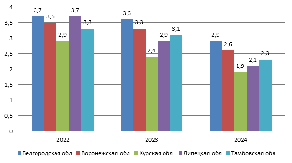 - уровень безработицы за период 2022-2024 годы сокращается во всех регионах ЦЧР, что соответствует общероссийской тенденции и обусловлено действием обозначенных выше факторов;