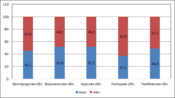 Рассматривая структуру безработных по полу за 2024 год в исследуемых регионах (рис. 6), отмечаем заметную разницу в региональном разрезе. Так, в Воронежской и Курской областях доля мужчин в составе безработных выше, а в других регионах – ниже. Липецкая область отличается самым низкой долей мужчин в структуре безработных (37,2%), что, по нашему мнению, обусловлено особенностью специализации хозяйства региона.