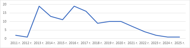 Пик интереса российских исследователей к теме патентной системы налогообложения был инициирован введением в действие патентной системы налогообложения как нового специального налогового режима (глава 26.5 НК РФ с 1 января 2013 года) и практически исчез после отмены ЕНВД в 2021 году. Поэтому основное количество статей появилось в преддверии введения – объясняя новый порядок налогообложения, и первые годы после, анализируя практику применения нового специального режима. Распределение статей посвященных патентной системе налогообложения в русскоязычном сегменте научных публикаций с 2011 по 2025 гг. представлен на рис.1.