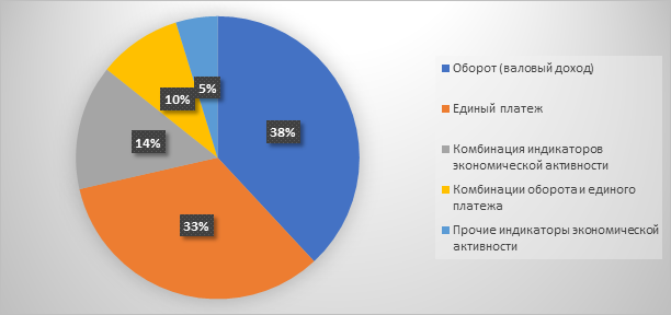 Наиболее распространенными являются налоги, основанные на определении потенциального оборота или валового дохода (рис.2). Рисунок показывает, что треть вмененных налоговых режимов основана на определении оборота, а треть предполагают уплату единого платежа без определения дохода.