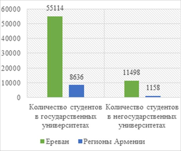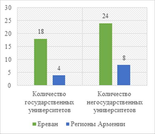 Одной из важных особенностей рынка услуг высшего образования в Республике Армения, как уже отметили, является его централизация по регионам. Около 82% действующих государственных университетов и около 75% негосударственных университетов расположены в Ереване, что ограничивает возможности доступа к образованию и территориального равенства в регионах (рис. 1).