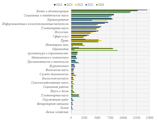Следующей особенностью является превалирование популярных специальностей, как бизнес и администрация, экономика, медицина, социальные науки и юриспруденция (рис. 2). Положительным структурным сдвигом последних пяти лет является увеличение доли студентов по направлению информационные и коммуникационные технологии. Данное изменение отражает увеличение роли цифровизации экономики и рост спроса со стороны работодателей. В тоже время отметим, что инженерное дело и естественные науки привлекают намного меньше студентов, несмотря на стратегическую роль в инновационной активности и экономическом развитии страны. Для экономической безопасности и технологического развития страны также важны такие направления, как биологические науки, химия, сельскохозяйственные науки, ветеринария, охрана окружающей среды. Однако данные специальности имеют критически низкую долю студентов, в связи с чем создается угроза кадровой безопасности. С другой стороны, учитывая увеличение спроса на специалистов именно таких отраслей, нарастающий дисбаланс между популярными и стратегическими специальностями указывает на ухудшение несоответствия между образовательными услугами и требованиями рынка труда.