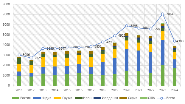 Рисунок 3. Динамика численности иностранных студентов в Республике Армения в 2011-2024 гг.