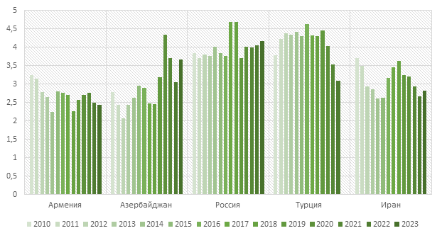 Для успешного качественного развития системы образования важным фактором является достаточно высокий уровень государственных расходов (рис. 5). Рассмотрим приоритетность системы образования в государственной политике стран региона. В течение рассматриваемого периода в Армении показатель государственных расходов на образование к ВВП колеблется около 2.5%. Такие же низкие показатели наблюдаются также в соседнем Иране. Это указывает на второстепенную роль образовательной системы в государственных приоритетах, ограничивая бюджетные возможности образовательной сферы, особенно высшего образования, так как большинство этих расходов направляются на содержание школ и дошкольных учреждений.