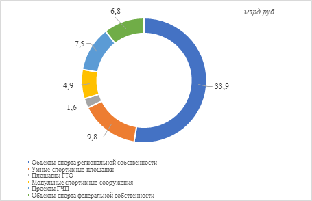 Для создания спортивной инфраструктуры региональной и федеральной собственности средства федерального бюджета распределились следующим образом (рис.1): большая часть (33,9 млрд.руб) направлена на объекты спорта региональной собственности, вторая часть (30,6 млрд.руб) распределена между: умные спортивные площадки, площадки ГТО, модульные спортивные сооружения, проекты ГЧП, объекты федеральной собственности.