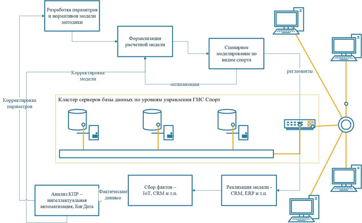 1) сбор и интеграция данных. Элементами реализации данного контура могут стать IoT-сенсоры, датчики посещаемости, календарно-сетевые графики сборов, системы бронирования, реестры спортсменов и тренеров, ВРОС и т.д.,