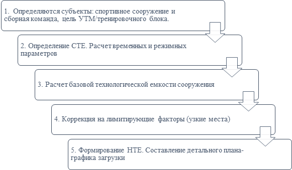 2) показатели сборной команды как потребителя технологической мощности, вид спорта, численность участников учебно-тренировочных мероприятий (далее – УТМ). Мы так же вводим стандартную тренировочную единицу (далее – СТЕ), которая представляет собой формализованное описание минимальной содержательной тренировочной задачи, и соответственно ее параметры по видам спорта. Например, специализированная водная подготовка для группы высшего спортивного мастерства в плавании – 2 человека на дорожке, групповая тактическая подготовка основного состава сборной команды на всем футбольном поле и др.;