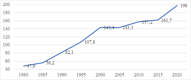 Рис. 2. Отношение активов НБФУ США к их ВВП страны, 1980-2020 гг., %