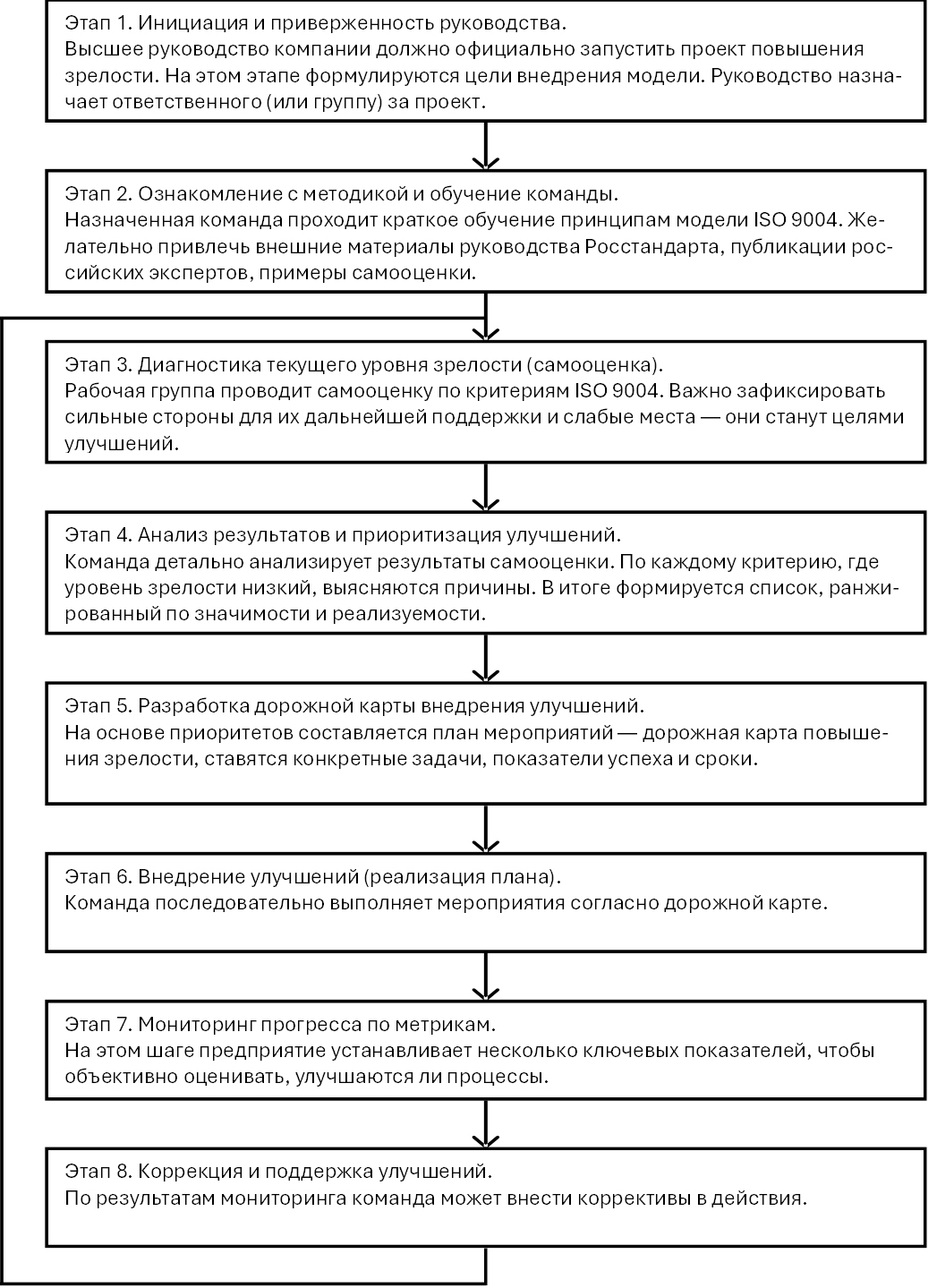 Схема отражает последовательность внедрения модели зрелости на базе ISO 9004 в малой технологической компании как управленческий цикл, начинающийся с институционализации проекта и заканчивающийся корректирующими действиями по результатам мониторинга. На этапе инициации высшее руководство формулирует цели повышения зрелости и закрепляет ответственность, что согласуется с тем, что ISO 9004 применим к организациям любого размера и включает механизм самооценки для анализа степени применения положений стандарта [1]. Далее выполняется этап ознакомления и обучения команды: изучаются критерии и логика «качества организации» и устойчивого успеха, включая ориентацию на ожидания заинтересованных сторон, поскольку именно ISO 9004 позиционируется как набор рекомендаций по достижению устойчивого успеха организации и смещает фокус от «качества продукта» к «качеству менеджмента/организации» [12]. В прикладной литературе по ISO 9004 подчёркивается, что без такого общего понимания контекста организации и роли руководства корректная интерпретация результатов самооценки затруднена, поэтому обучение целесообразно опирать на публикации российских авторов, рассматривающих критерии и применение самооценки зрелости [10].