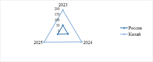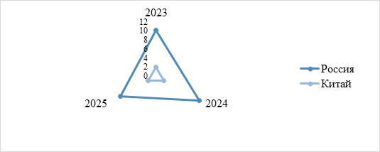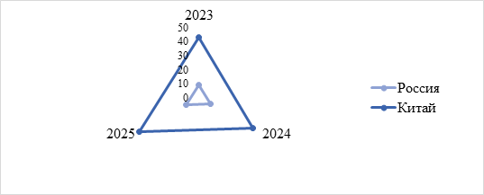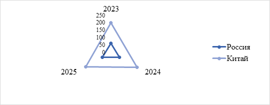 За исследуемый период в России произошло ежегодное увеличение реальной процентной ставки: в 2023 г. 3,36%, в 2024 г. 12,46%, в 2025 г. 14,0%. В китайской банковской системе за аналогичный период отмечены стабильно низкие значения показателя (минимальное 4,76% (2025 г.), максимальное 5,09% (2024 г.). Существенное расхождение в значениях России и Китая указывает на наличие кредитных рисков и выраженного инфляционного давления в российской экономике.