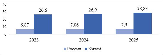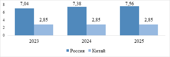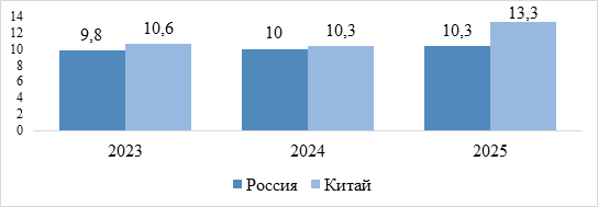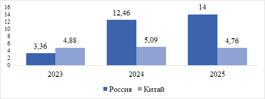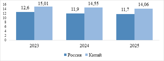 Спред между банковскими ставками по кредитам и депозитам в России, составляющий 7,04% (2023 г.), 7,38% (2024 г.), 7,56% (2025 г.) указывает на низкий уровень результативности банковского сектора и повышенные операционные издержки. В Китае, где значение показателя находится на уровне 2,85% (2023-2025 гг.), наблюдается более конкурентная и сбалансированная финансовая среда.