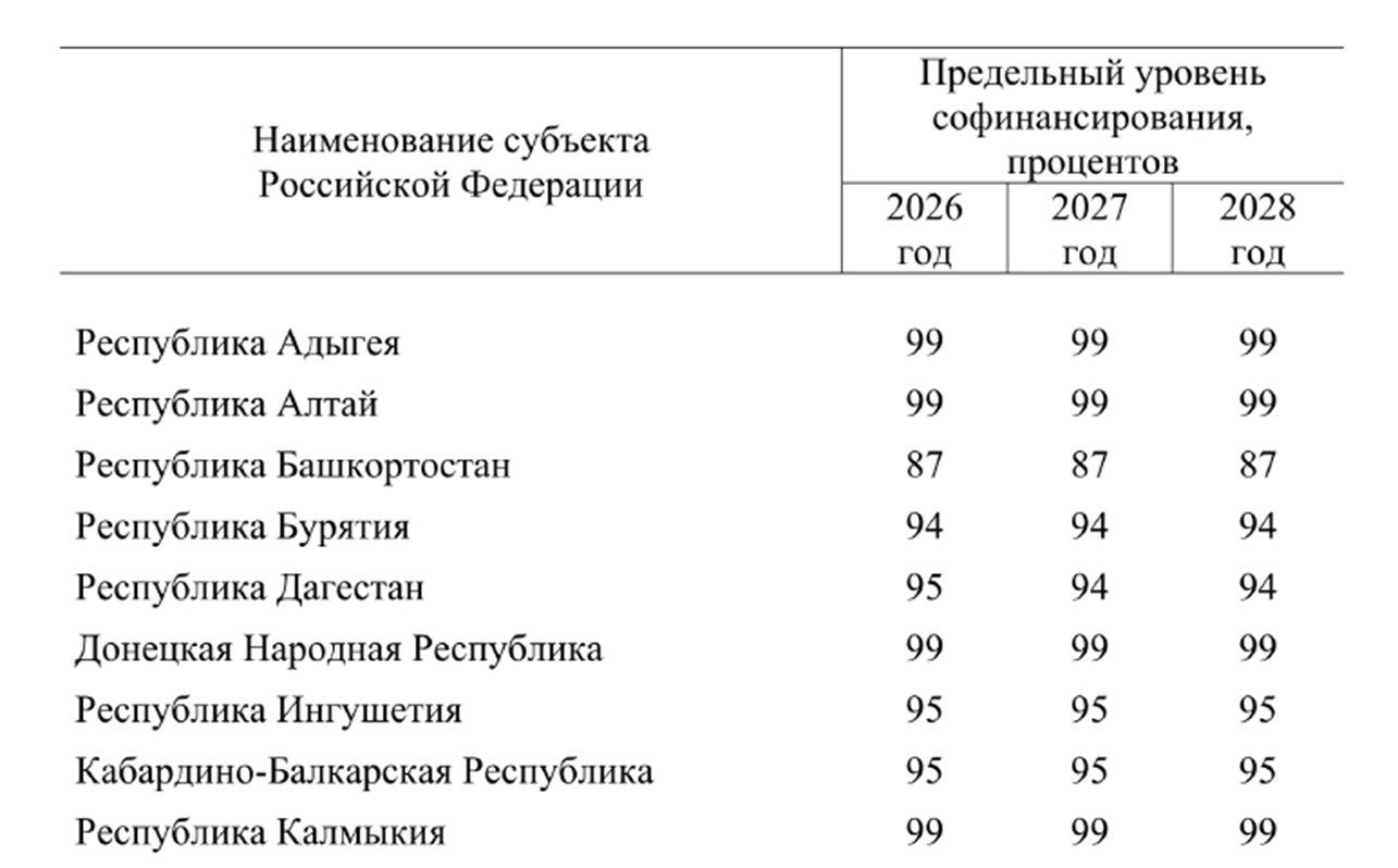 Таблица 2 – Пример объемов софинансирования для Республики Башкортостан (фрагмент из Распоряжения №2006-р)