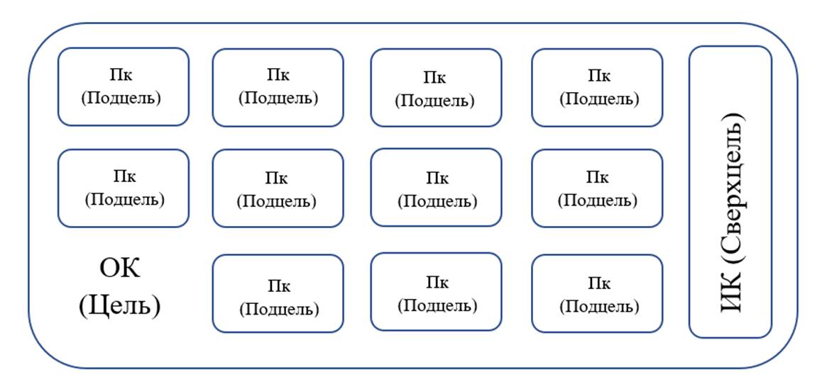 Логика метода заключается в том, что управление любым процессом развития системы невозможно без выявления и исследования цели каждого из отдельно выявленных компонентов (ОК, Пк, ИК), обуславливающих существование объекта. Через раскрытие Целей (ОК), Подцелей (Пк) и Сверхцели (ИК) появляется возможность их согласования и планирования результата, который будет получен при их достижении [5,9,10].