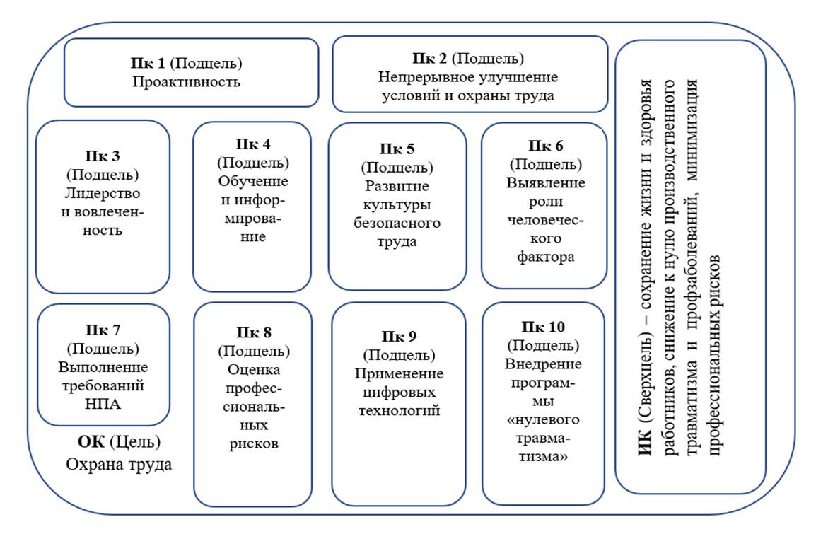 Подцель системы охраны труда выражена через категорию Подкачество (Пк), обозначающую наличие составных частей или подсистем в исследуемой системе. Число Пк определяется спецификой охраны труда и ее назначением. Пк взаимодействуют между собой, причем это взаимодействие может проявляться как в конкуренции, так и в партнерстве. Для системы охраны труда целесообразно выделить задачи, соотносимые с компонентами содержания охраны труда, выраженные такими уровнями, как: проактивность (Пк 1), совершенствование системы непрерывного улучшения условий и охраны труда на рабочих местах (Пк 2), лидерство руководителей и вовлеченность работников в соблюдение требований безопасного труда (Пк 3), обучение и информирование работников безопасным приемам выполнения работ (Пк 4), формирование и развитие культуры безопасного труда (Пк 5), выявление роли человеческого фактора в охране труда (Пк 6), выполнение требований законодательства в сфере охраны труда (Пк 7), оценка профессиональных рисков (Пк 8), применение цифровых технологий в области охраны труда (Пк 9), внедрение и совершенствование программы «нулевого травматизма» на предприятии (Пк 10).