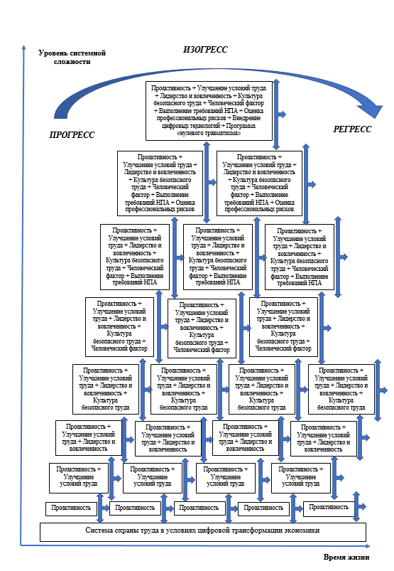 Во-первых, изогресс обеспечивается ОК, развитие системы охраны труда происходит по горизонтали, без существенного изменения организационной и системной сложности. Преобладают конкурентные отношения между обозначенными нами в данном исследовании ПК. Разрешение конкуренции возможно при условии выделения одного из ПК на роль ИК. Смена ИК в этом случае означает, что система охраны труда переходит в новую фазу изогресса без существенного изменения системной сложности [5]. Так, нижняя строка модели, демонстрирующая изогресс системы охраны труда, определяет первоначальную необходимость в проведении проактивных мероприятий в охране труда, которые заключаются в инициировании мер, направленных на прогнозирование, смягчение и предотвращение потенциальных негативных экономических, организационных, управленческих, технических, экологических или социальных последствий до того, как они материализуются. Данные действия руководителей всех уровней управления определяют ответственность за будущее, прогнозирование проблем и возможностей в области охраны труда с целью разработки плана действий до наступления кризисной ситуации.