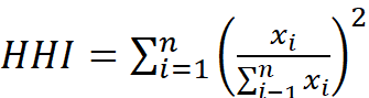 Широко используемый в исследованиях отраслевого и территориального развития Индекс Херфиндаля-Хиршмана (Herfindahl-Hirschman index) рассчитывается по формуле 1: