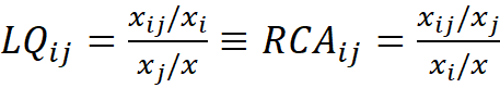 Делая обзор формул (1) – (7) не трудно заметить, что все они основываются на базовом элементе – соотношении индивидуального (регионального или отраслевого) объема с общей его величиной. Показателем, напрямую отражающим эту концепцию, является очень часто используемый в исследованиях коэффициент LQ (Location quotient). В русскоязычной научной литературе можно встретить такие его названия как, например, «коэффициент локализации» или «коэффициент отраслевой специализации», который может применяться в двух контекстах: оценка концентрации отрасли в региональном разрезе или оценка региональной специализации в определенных видах экономической деятельности [5-7]. Такая универсальность применения метода объясняется тем, что непосредственно индикатор LQ, оценивающий отраслевую концентрацию согласно своей формуле, математически тождественен индикатору RCA (Revealed Comparative Advantage) Index, формула которого представляет собой метод оценивания региональной специализации [26]: