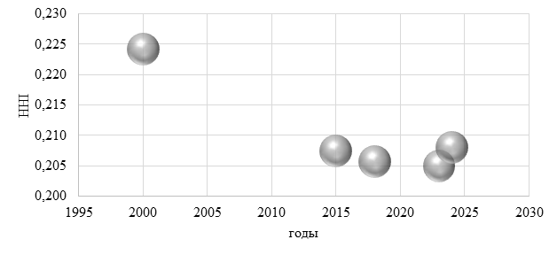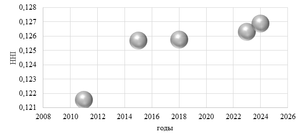 При интерпретации полученных значений индекса HHI ориентируются на общепринятую шкалу [15]: низкая концентрация HHI < 0,15; умеренная если HHI от 0,15 до 0,25; высокая HHI > 0,25.