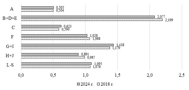 Оценивая локализацию экономики России на фоне ее участия в союзе БРИКС, логично ожидать выделение сектора добывающей промышленности, что подтверждается высокими значениями коэффициента LQ, который, однако, несколько снижается (2,2 в 2018 г. против 2,07 в 2024 г.) с начала периода глобальных кризисов (рисунок 3).