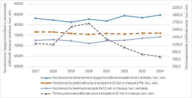 Численность рабочей силы за рассматриваемый период колеблется в пределах 75,46 млн. человек (2020 г.) до 76,66 млн. человек (2017 г.), достигнув к 2024 году 76,1 млн. человек. Несмотря на наличие периодов роста численности лиц в трудоспособном возрасте, заметных темпов роста в численности рабочей силы не наблюдается. Положительные значения темпов прироста по отношению к прошлому периоду были только в 2021, 2023 и 2024 годах, но и они не превышали 1%: 0,67%, 0,53%, 0,09% соответственно. Эффект от пенсионной реформы отразился в большей степени на значениях показателя населения трудоспособного возраста и практически не проявился в изменении экономически активного населения. Как отмечает Капелюшников Р.И., полученный прирост в рабочей силе во многом был поглощен негативными проявлениями «демографической ямы» и последствий пандемии [7, с. 10].