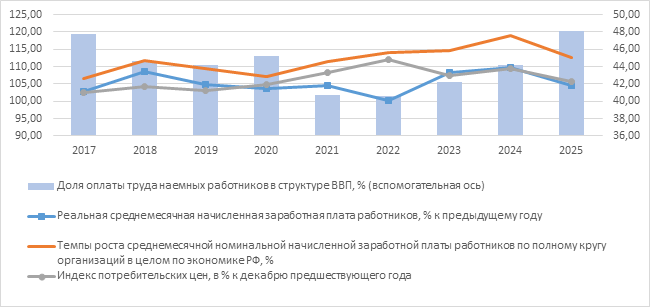 Рисунок 2 – Динамика показателей оплаты труда и инфляции за 2017-2025 гг.