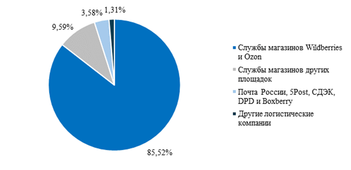 Данные, представленные в таблице 1 показывают, что рынок логистики электронной коммерции в России характеризуется высокой степенью концентрации. Большую часть логистики внутрироссийской интернет-торговли занимают службы магазинов — 95% (рисунок 1), из которых на Wildberries и Ozon приходится 85%. Существенная часть потоков замкнута внутри экосистем крупнейших маркетплейсов, которые совмещают функции торговой платформы, организатора заказов и логистического оператора.