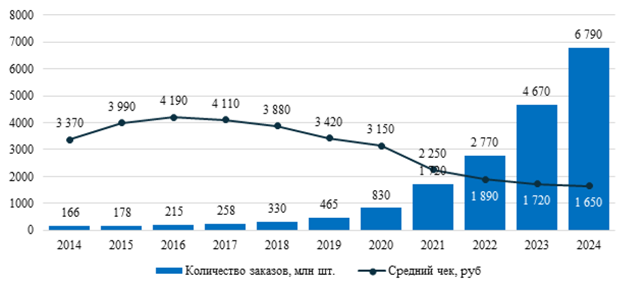 Рисунок 2 – Динамика числа заказов и средний чек в электронной коммерции в России, 2014–2024 гг., (составлено авторами по [10])
