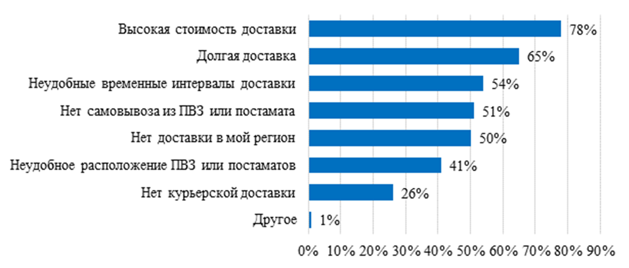 При этом рост нагрузки на логистическую инфраструктуру не означает снижения требований со стороны покупателей. Напротив, потребители по-прежнему чувствительны к параметрам доставки, и именно они нередко становятся причиной отказа от покупки на этапе оформления заказа. По данным опроса Data Insight [13], проведенного в октябре 2023 года среди 1145 покупателей интернет-магазинов, совершивших как минимум одну онлайн-покупку за последний месяц, наибольшее значение для клиента имеют стоимость доставки, ее скорость, удобство временных интервалов и доступность подходящего способа получения заказа. Результаты данного опроса представлены на рисунке 3.