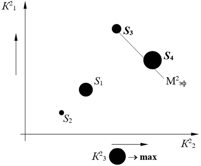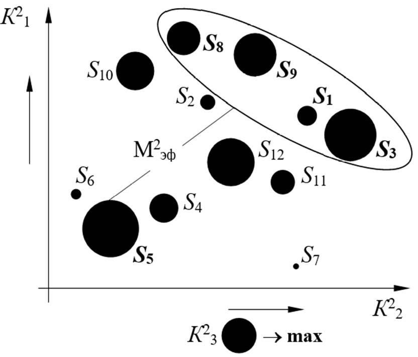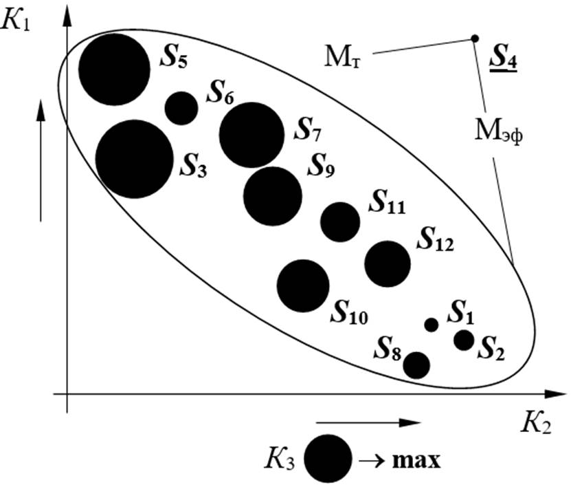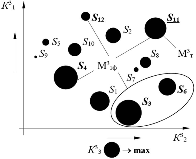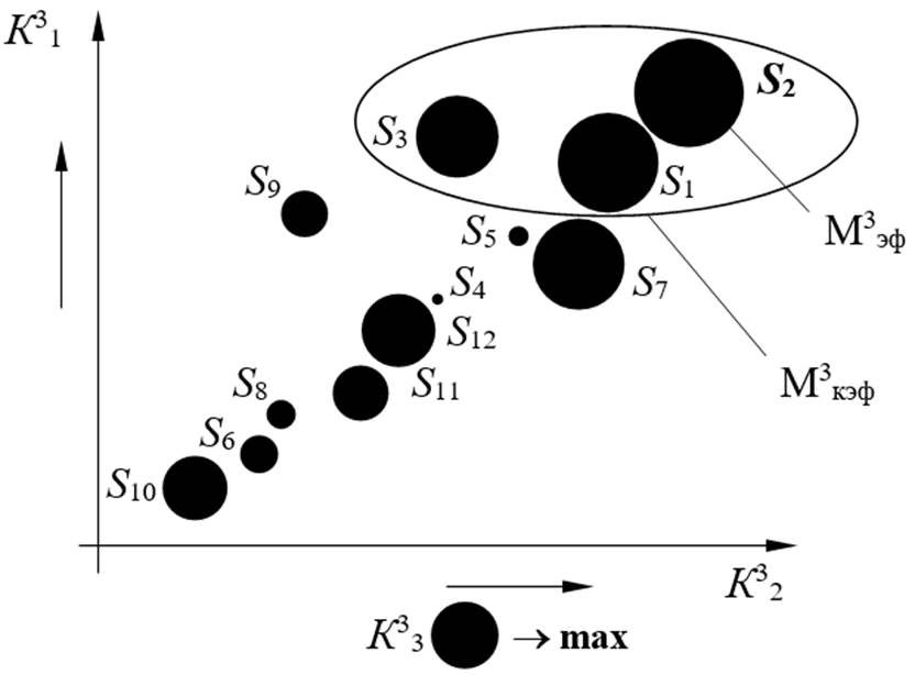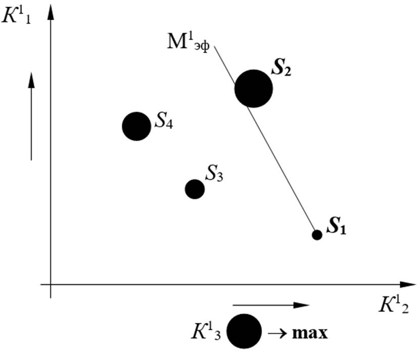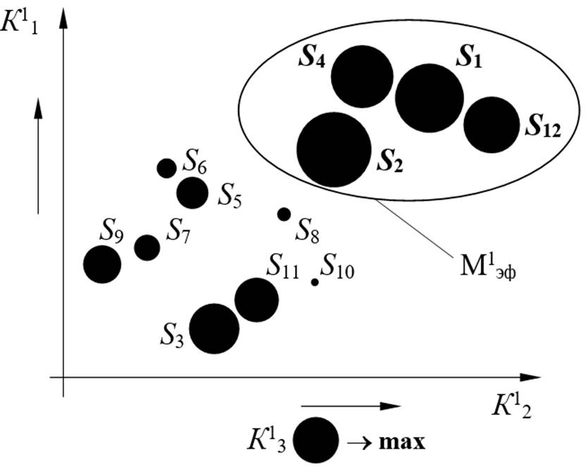 Поскольку паретовское множество в третьей проекции самое малочисленное, сформируем в ней второй ранг М32р = {S1, S3} и квазиэффективное (объединенное первого и второго рангов) множество М3кэф = {S1, S2, S3}. Далее согласно принципу комбинированного выбора, находим более мягкое (умеренное) решение Мэф\кэф = {S1, S2, S4, S12} ∩ {S1, S3, S5, S8, S9} ∩ {S1, S2, S3} = {S1}.