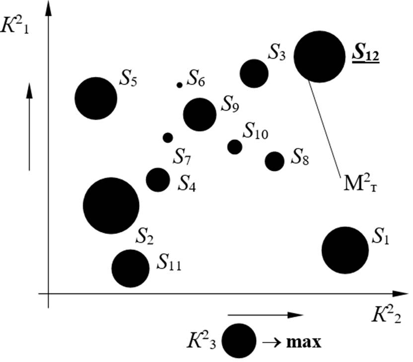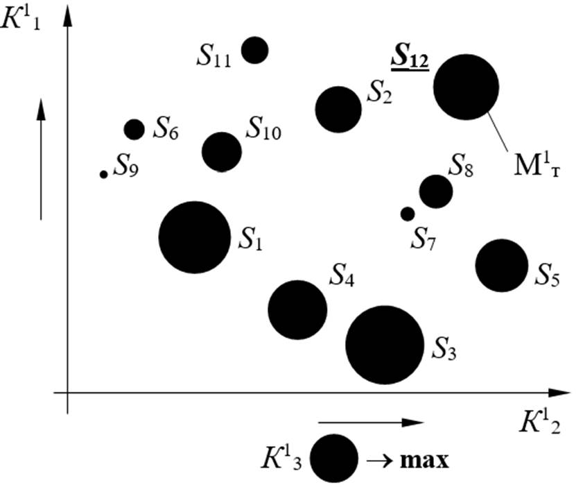 Для иллюстрации сказанного обратимся к классическому эффективному выбору в трехпроекционной постановке. Информацию по экономическим системам S1–S12 представим на рис. 1–3. Здесь и далее первый и второй показатели задают положение центра окружности, третий показатель соответствует диаметру, направления оптимизации обозначены стрелками, а верхний индекс указывает на номер проекции.