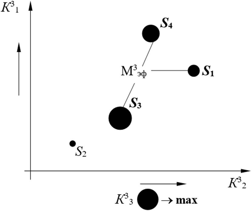 Учитывая М3эф = {S1, S3, S4} и пересекая частные множества проекций получаем Мэф = {S1, S2} ∩ {S3, S4} ∩ {S1, S3, S4} = Ø. Привнося в процедуру все вторые ранги (М12р = {3, 4}, М22р = {1}, М32р = {2}), синтезируем симметричное квазиэффективное решение Мкэф = {S1, S2, S3, S4} ∩ {S1, S3, S4} ∩ {S1, S2, S3, S4} = {S1, S3, S4}.