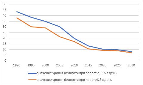 Рисунок 1. Доля населения, живущего менее чем на 3 доллара в день по ППС в 2021 году и 2,15 доллара в день по ППС в 2017 году, 1990-2030 годы (в процентах) [27].