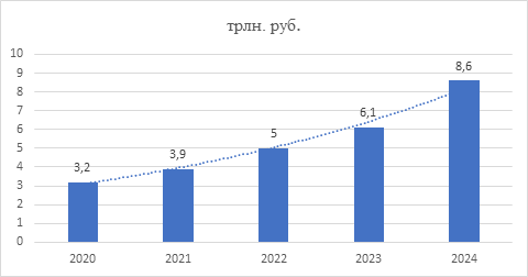 Интернет-торговля в России развивается в целом по общемировому сценарию, хотя по некоторым оценкам, среднегодовые темпы прироста оборота заметно превышают подобные значения большинства стран. Оборот рынка eCommerce в России увеличился почти в 3 раза: с 3,2 до 8,6 трлн. руб [5]. Динамика оборота онлайн торговли России за период 2020-2024гг. представлена на рисунке 2.