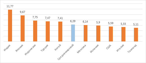 Прогноз среднемировых темпов прироста оборота розничных продаж составляет 6,29%. Среди стран, которые, предположительно, превысят указанный показатель, нет ни одной европейской страны. Самые высокие темпы прироста, значительно выше среднемировых, по прогнозу ожидают от Индии – 11,77%. За ней следуют Япония, Индонезия, Турция и Китай. Показатели этих стран составят 9,67; 7,75; 7,47 и 7,41 соответственно (рисунок 3).