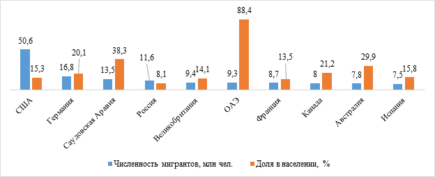 Рис. 1 – Топ-10 стран мира по численности и доле мигрантов в населении