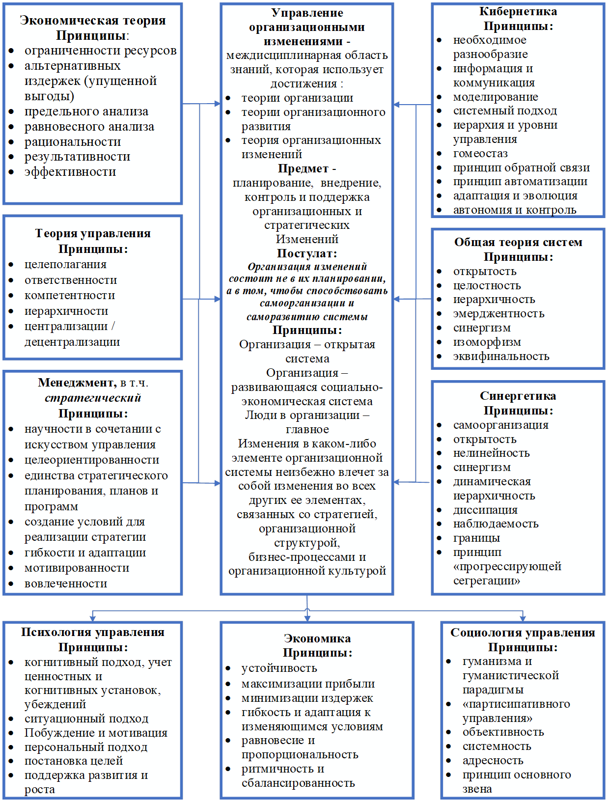 Рисунок 1 – Взаимосвязь наук в контексте их междисциплинарного синтеза как методологического аппарата проведения организационных изменений [разработано авторами на основе 36, с. 159-160; 8, с. 182]