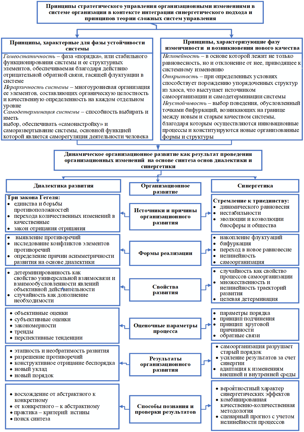 Они составляют фундаментальную основу стратегического управления организационными изменениями и требуют интеграции синергетического подхода и теории сложных систем управления, построенной на фундаментальных основах законов диалектики. Теорию сложных систем управления возможно рассматривать как междисциплинарную научную парадигму, изучающую системы, состоящие из множества коррелированных и взаимодействующих компонентов, управление которыми непрерывно усложняется. Причинами этого в организации являются возрастание сложности задач информационного обеспечения в условиях цифровой трансформации, а также непредсказуемые изменения во внешней среде, спонтанное зарождение новых, нестандартных связей в сетях стейкхолдеров, которые не могут быть сведены к аддитивной сумме свойств их составляющих. Следует учитывать, что признаками сложных социально-экономических систем, к которым относятся организации, выступают эмерджентность, самоорганизация, нелинейность и адаптивность, чрезвычайно важные с точки зрения теории и практики управления стратегическими организационными изменениями.
