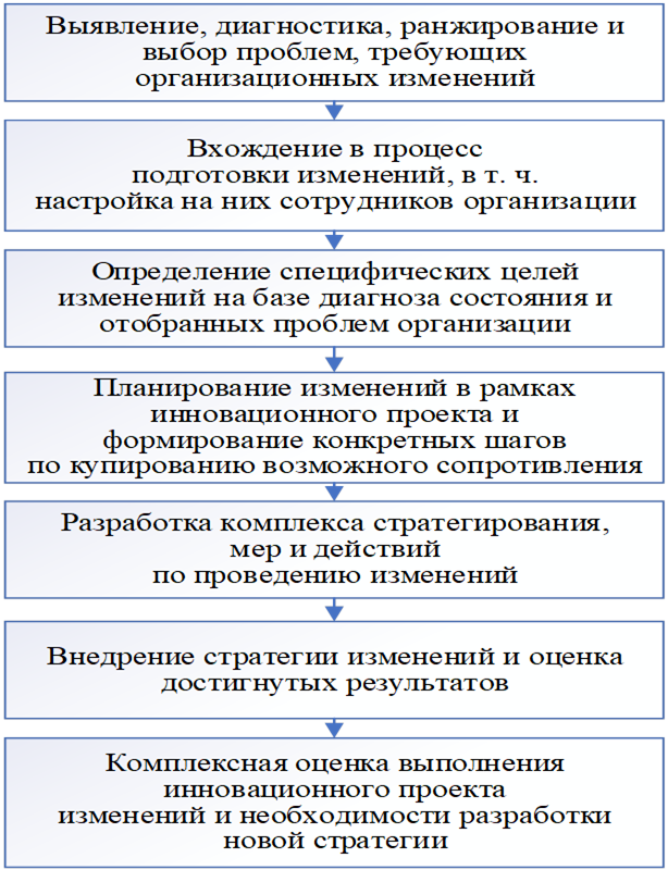 На рисунке 3 представлены последовательные этапы моделирования и проведения стратегических организационных изменений, которые могут быть проведены в рамках соответствующего инновационного проекта.