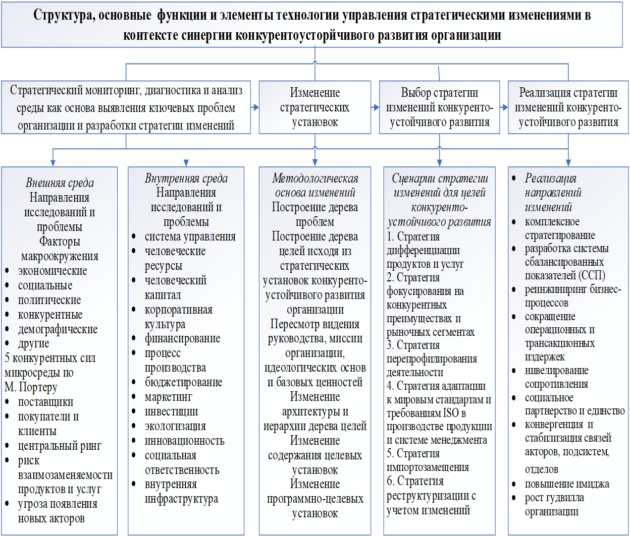 Целями статьи являются – формирование методологических принципов и постулатов междисциплинарного синтеза комплекса сопряженных наук для его дальнейшего инструментального применения в технологии стратегирования и управления организационными изменениями; определение структуры, основных функций и составляющих технологии управления изменениями с позиций достижения синергии этапов конкурентоустойчивого развития организации. Научная новизна исследования, обеспеченная в рамках первой цели, заключается в акцентировании методологических принципов и постулатов междисциплинарного синтеза таких связанных наук, как теория организации, теория организационного развития, стратегический менеджмент, а также ссвязанных с ними наук, которыми выступают теория сложных систем управления, синергетика, социальные и психологические дисциплины. Названные дисциплины изучают различные аспекты функционирования организаций, однако имеют общую область их пересечения, которой является управление организационными изменениями. «Инструментальная поддержка» организационных изменений на основе принципов междисциплинарного синтеза высоко продуктивна и повышает научный уровень процесса адаптивного стратегирования в организации. Научная новизна, полученная в рамках достижения второй цели, состоит в структурировании агрегированных функций и этапов процесса стратегирования и управления конкурентоустойчивым развитием организации, результативность которых поддерживается интеграцией организационных стратегий и стратегий организационных изменений.