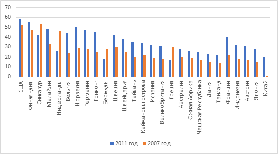 Рис. 1. Сравнение уровня сервитизации в 27 странах с акцентом на динамику изменений в период с 2007 по 2011 год / Fig. 1. Comparison of servitization levels in 27 countries with a focus on dynamics of change from 2007 to 2011.