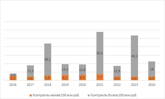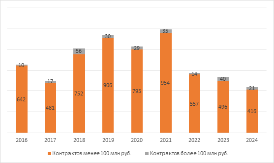 В то же время сегмент контрактов стоимостью менее 100 млн руб. демонстрирует устойчивое развитие с среднегодовым объёмом в пределах 4–5 млрд руб. По итогам 2024 года заключён 21 крупный контракт (100 млн руб. и более) и 416 договоров меньшего объёма, что можно увидеть на графике ниже [7].