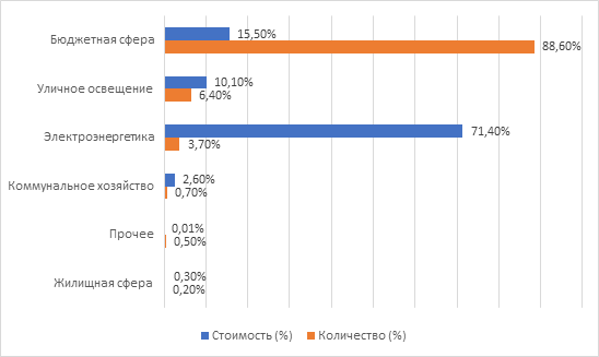 На долю бюджетной сферы приходится подавляющая часть заключенных контрактов (88.6%), однако их совокупная стоимость составляет лишь 15.5%. Напротив, электроэнергетика при низкой доле по количеству контрактов (3.7%) обеспечивает 71.4% совокупной стоимости рынка благодаря реализации единичных, но крайне дорогостоящих проектов. Такое распределение отражает специфику рынка, где масштабные энергетические проекты сосуществуют с многочисленными, но менее капиталоемкими контрактами в бюджетной сфере. Уличное освещение заняло промежуточное положение, войдя в топ-3 как по числу контрактов (6.4%), так и по стоимости (10.1%). Прочие отрасли – коммунальное хозяйство, жилищная сфера играют незначительную роль (рисунок 5).